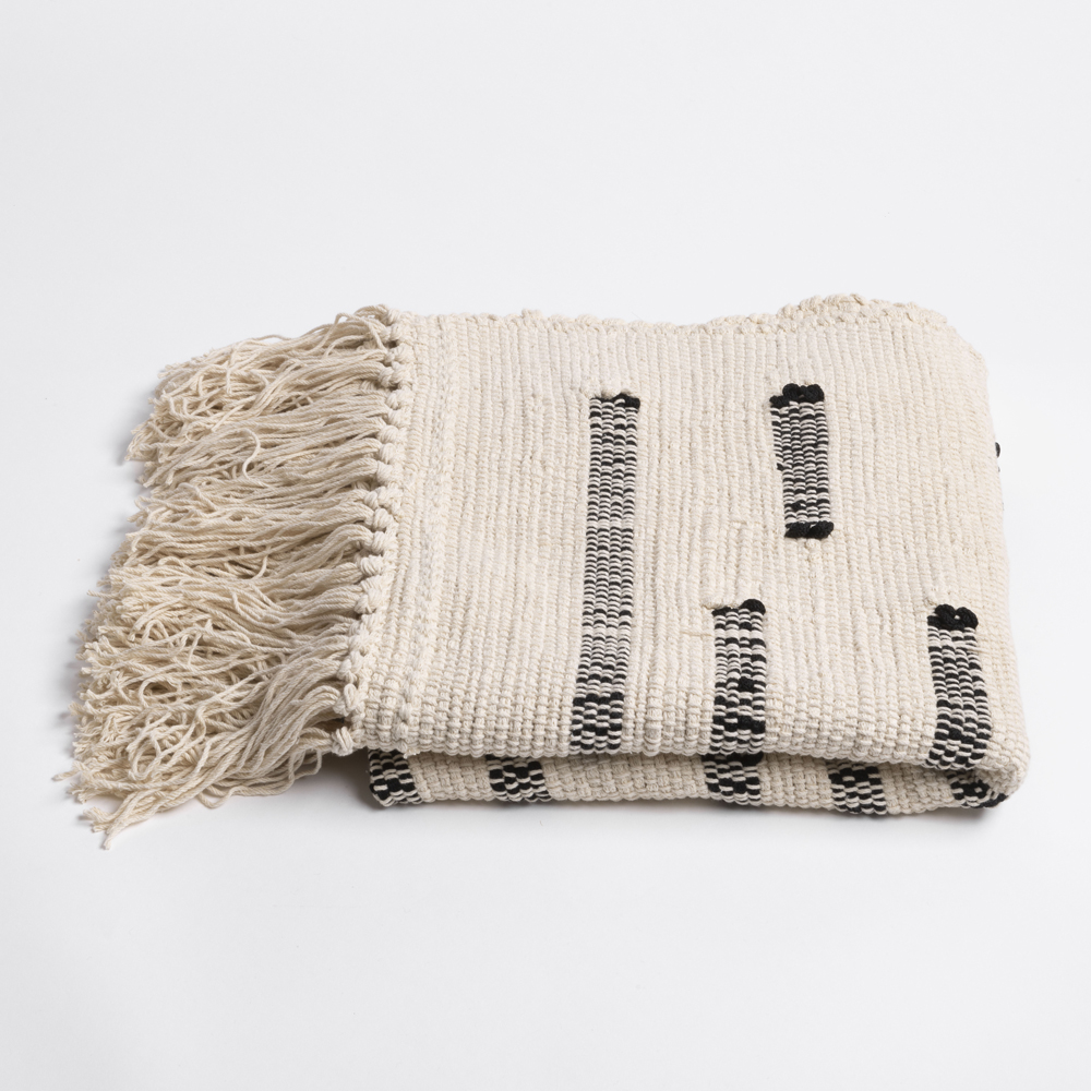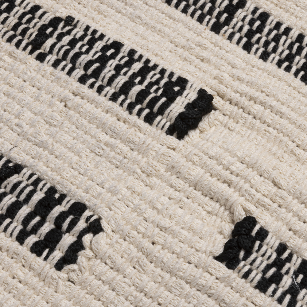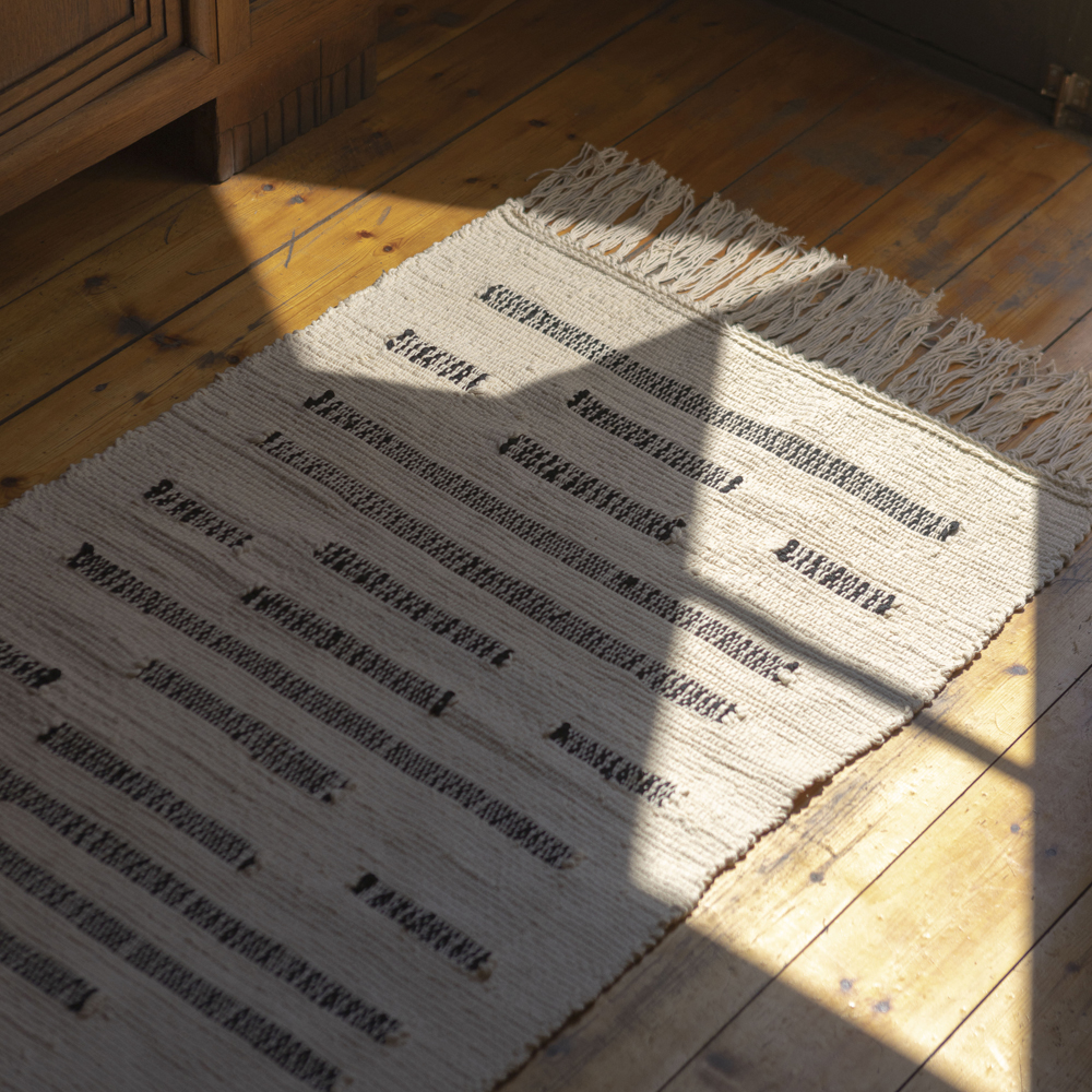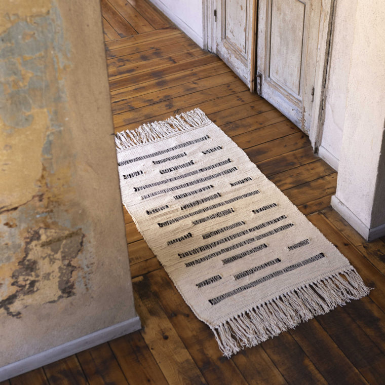 Φτιαγμένο από ένα ζεστό μείγμα βαμβακιού , αυτό το χειροποίητο υφαντό χαλί χαρίζει απαλότητα σε κάθε χώρο με τη φυσική, υπόλευκη βάση του και το γεωμετρικό μοτίβο από μαύρες γραμμές. Δημιουργώντας ένα οπτικό παιχνίδι ανάμεσα στη συμμετρία και την ασυμμετρία, το χαλί αντλεί έμπνευση από τις βαθιά ριζωμένες έννοιες της ισορροπίας και της γεωμετρίας που έχουν διαμορφώσει τον παγκόσμιο πολιτισμικό χώρο.